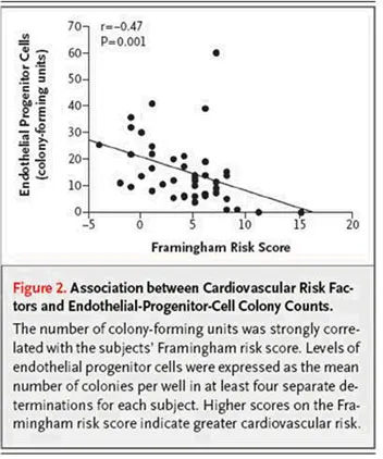 In a study published in the New England Journal of Medicine, it was hypothesized that EPCs had a significant role in continuing endothelial repair, where decreased or damaged mobilization would contribute to endothelial dysfunction and cardiovascular disease progression. They measured the amount of circulating EPCs that were able to form colonies (colony-forming units) in blood samples of 45 men who had differing degrees of cardiac risk factors but had never suffered cardiovascular disease. It was shown that a strong correlation existed between the number of circulating EPCs and the subject's Framingham Risk Score - a measure of risk for cardiovascular disease (see graph to the right). Significant correlations also existed between the amount of progenitor cells and the participant's endothelial function; levels of circulating EPCs were actually a better predictor of vascular reactivity than the existence or nonexistence of cardiac risk factors.